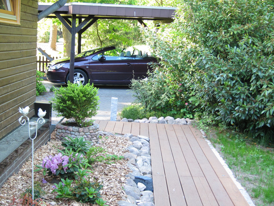 Die blickdichte große Sonnenterrasse mit warmen Holzbohlen lädt zum Entspannen ein. Das Grundstück ist gut umzäunt und großrahmig umpflanzt.